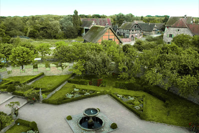Les Jardins de l'Ecomusée Au coeur de son village, l'Ecomusée renferme deux magnifiques jardins médiéval et renaissance. Organisé en quatre carrés, le jardin médiéval abrite des plantes médicinales, aromatiques et ornementales. Jardin d'agrément, le jardin renaissance préfigure l'art du jardin à la française tel que nous le connaissons aujourd'hui. |